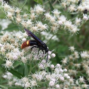 Rarely stings unless threatened. Females burrow in the ground and lay their eggs on grubs (such as Japanese Beetle). The wasp larvae consumes the grub as they grow.