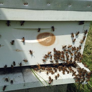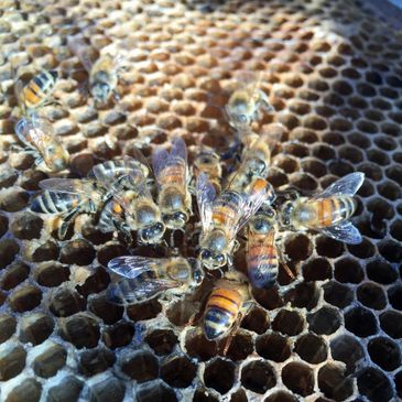 Honey bees live in colonies in bee hives. We have a few bee hives here at Calico Fields.